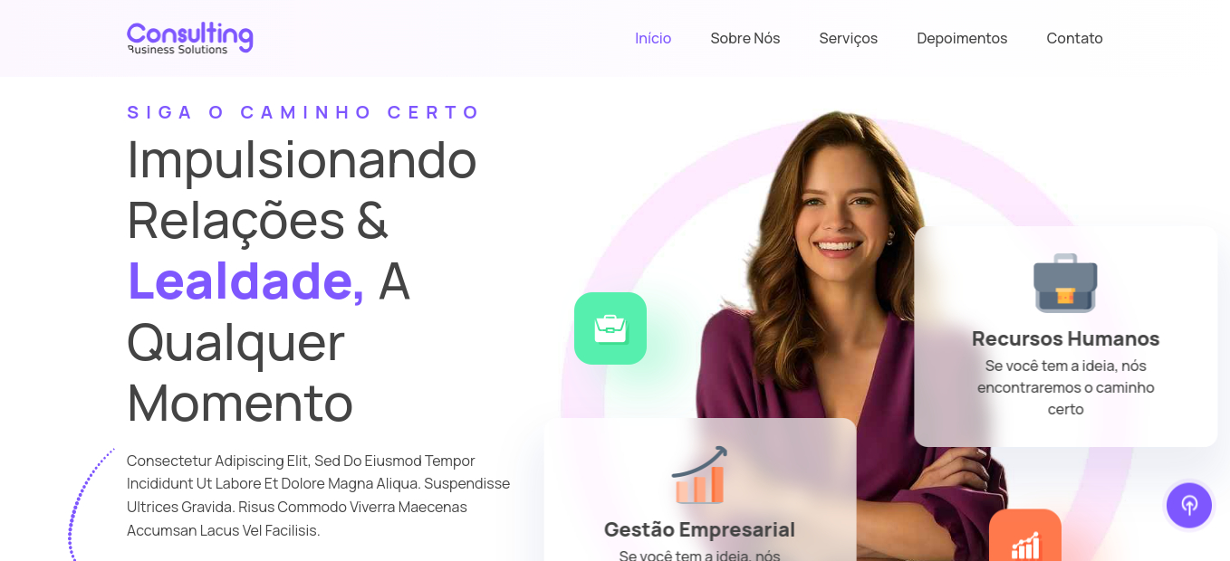 O site "Consultoria" oferece um modelo de site ideal para empresas de consultoria. Inclui seções para exibir serviços, perfis de consultores, depoimentos de clientes e uma área de contato. O design é moderno e intuitivo, facilitando a apresentação de informações e a captação de clientes.
