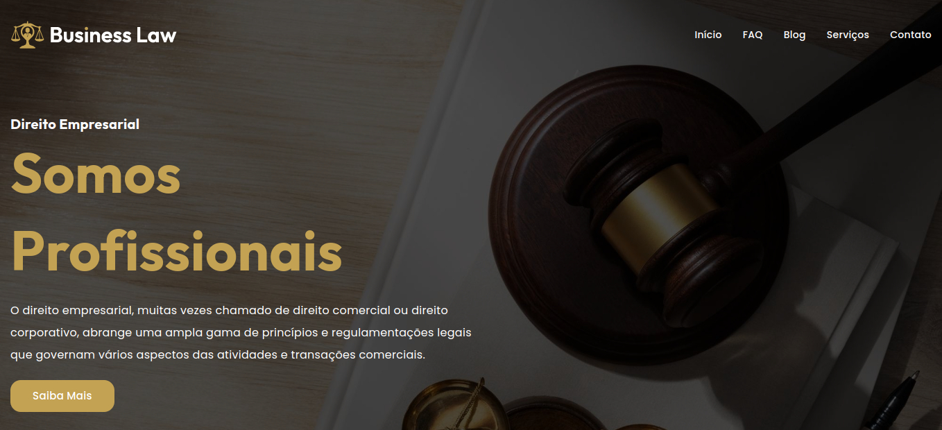 O site "Direito Empresarial" oferece um modelo de site ideal para escritórios de advocacia especializados em direito empresarial. Inclui seções para exibir serviços jurídicos, perfis de advogados, depoimentos de clientes e uma área de contato. O design é moderno e intuitivo, facilitando a apresentação de informações e a captação de clientes.