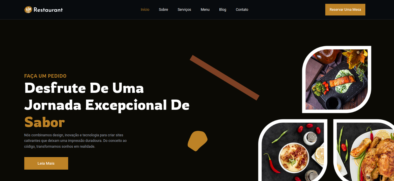 O site "Restaurante" oferece um modelo de site ideal para restaurantes. Inclui seções para menu, reservas, depoimentos de clientes e uma galeria de fotos dos pratos. O design é moderno e intuitivo, facilitando a navegação e a apresentação dos serviços do restaurante.