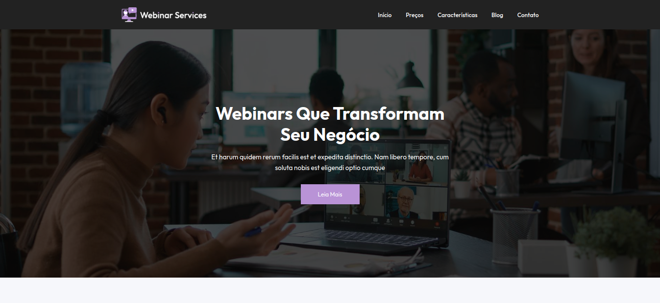 O site "Serviços de Webinar" oferece um modelo ideal para promover e gerenciar webinars.