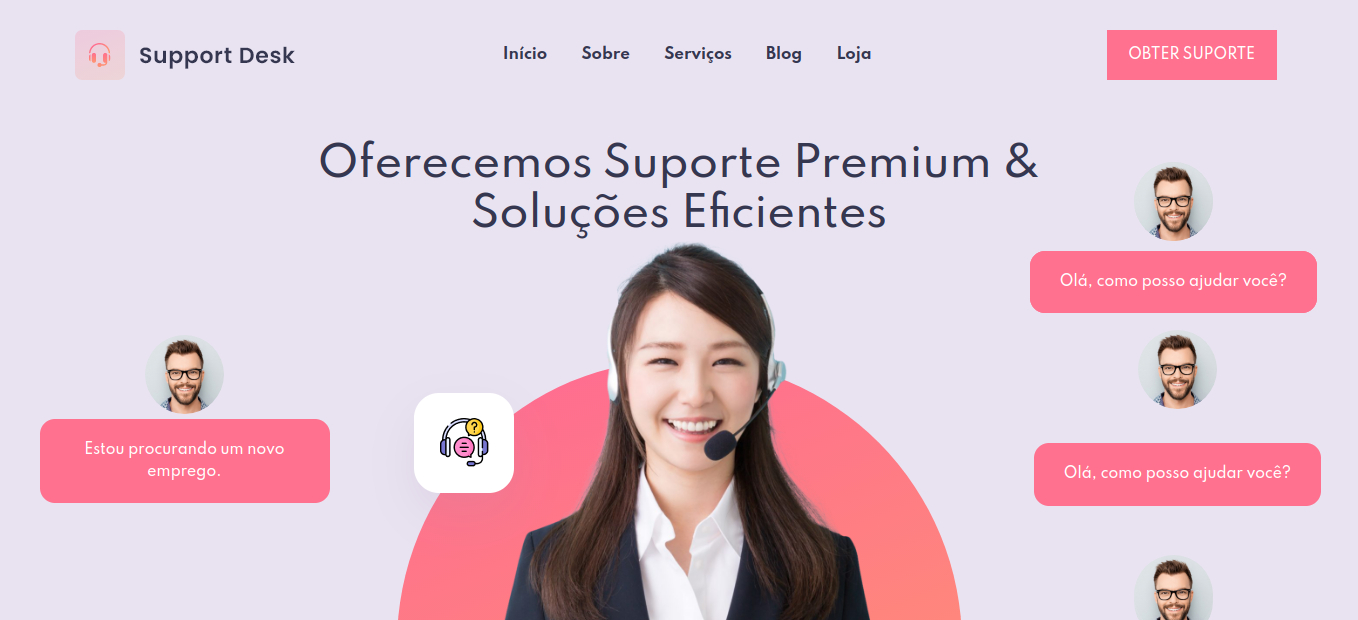 O site "SupportDesk" oferece um modelo de site ideal para serviços de suporte técnico.